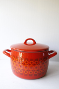 フィンランド、フィネル社をのホーロー製キャセロールです。こちらはフォルムデザインを、カイフランクが、デコレートデザインをライヤ・ウォシッキネンが担当しています。ケトルやランプにも使用されている人気のデザインです。可愛らしく華やかなデザインは、調理後、そのままテーブルに出して、目の前でお料理をサーブしたくなりますね。とても絵になるキャセロールですので、使わないときも見える場所に置いて、北欧インテリアを堪能してください。ホーロー製品は、よいコンディションのものを探すのが難しいアイテムです。