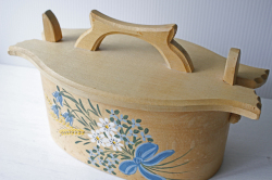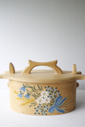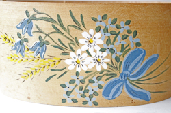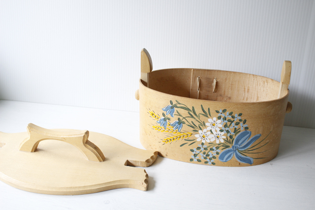 デンマークで見つけた木製のお裁縫箱です。しっかりとした作りの裁縫道具箱で木の温かみが感じられるナチュラルな造りで、ハンドペイントでフラワーモチーフが描かれています。お裁縫道具を入れたり、クラッカーのような保存食を入れたりと多様にお使いください。北欧らしいほっこりとした工芸品です。