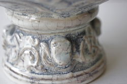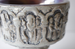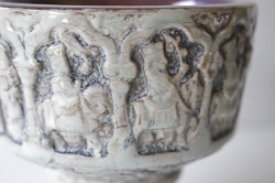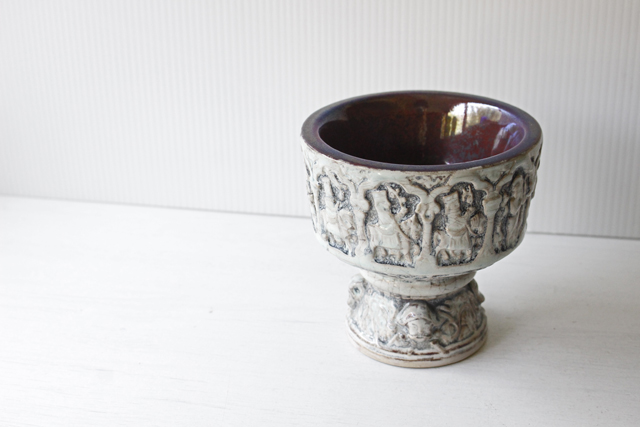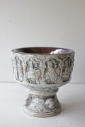 デンマーク、Michael Andersen & Son社の足つきボウルです。日本の高杯のようなフォルムで側面には高貴な方の誕生から没するまでを描いたようなデザインとなっています。下部には不思議な動物の頭が形作られていて、とても凝った造りになっています。内側はマットで淡いブルーのような釉薬がかけられており、聖水のような幻想的な雰囲気を漂わせています。オブジェとして飾っていただくとよいでしょう。どっしりとして、落ち着いたお部屋を演出してくれます。今回はホワイトカラーの釉薬でとても珍しい作品です。