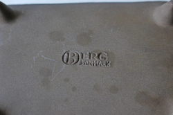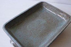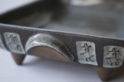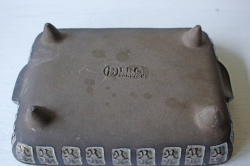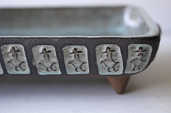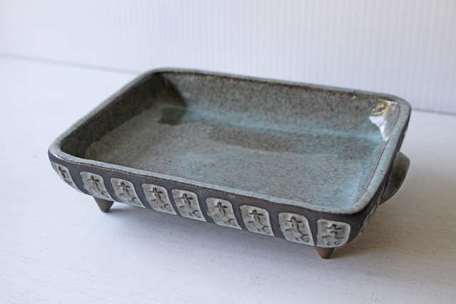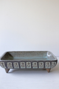 デンマークのアンティークショップで見つけた脚付きの角皿です。こちらはデンマークのBerg社の作品で長方形の平皿に足が付いたデザインです。淵周りには帽子を被った人型がぐるりとデザインされたユニークな作品です。