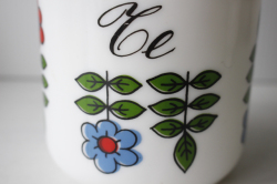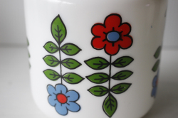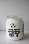 デンマークで見つけたガラス製のキャニスターです。こちらはレトロ感溢れるフラワーモチーフでとてもノスタルジックな印象です。大きめの容器ですので、お手入れもしやすく、たっぷりとお使い頂け、またミルクガラスの素材でしっかりとした造りです。Teとデンマーク語で書いてあるのが、北欧らしくキッチンを明るく彩ってくれ、お勧めです。密閉機能はありません。