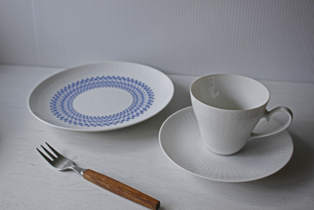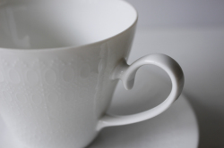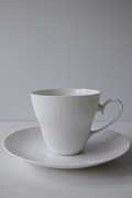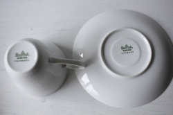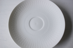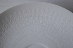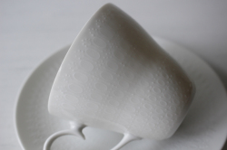 ドイツの一流ブランド、ローゼンタールのスタジオラインのカップ&ソーサーです。 Bjorn Wiinblad(ヴィヨルン・ウィンブラッド)デザインのロマンスというシリーズで、ピュアホワイトの薄手の地にドットのエンボス模様がぐるりと並んだ可愛い雰囲気です。繊細で上品なシリーズは乙女心をくすぐります。