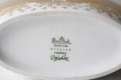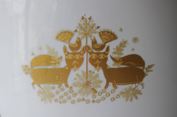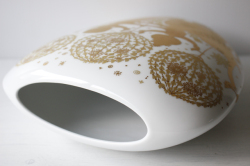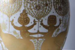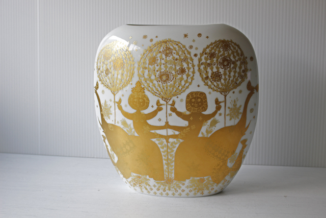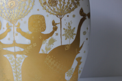 デンマークの人気デザイナーBjorn Wiinblad(ヴョルン・ウィンブラッド)がドイツ・ローゼンタール社のためにデザインしたフラワーベースです。柔らかな曲線のオーバル型の優雅なフォルムに、ウィンブラッドならではの繊細な線描で象にのった男女が微笑んでいるとても素敵な作品です。ピュアな白磁にツヤを抑えたマットな金彩が施されることによって、気品ある仕上がりとなっています。大きさもほどよく、飾っていただきやすいと思います。