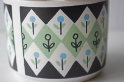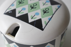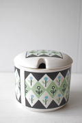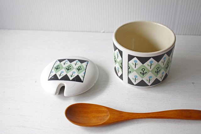 デンマークの小さな島(ボーホルム島)に1835年から1996年まで存在した陶器メーカーSoholm(スーホルム)のシュガーポットです。こちらはダイヤ型の幾何学模様の中にレトロなフラワーモチーフがデザインされたほっこりとした印象です。濃いグリーンとペパーミントグリーンの珍しいコンビネーションでとてもお勧めです。