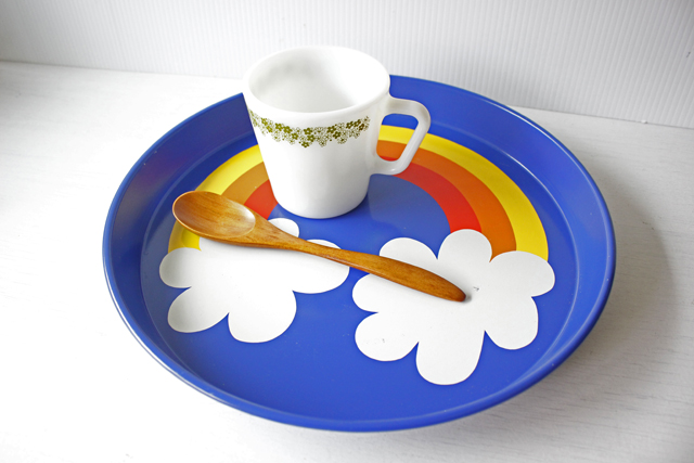 デンマークで見つけたヴィンテージのスチールトレイです。明るいブルーに白い雲と虹がデザインされたポップな雰囲気です。夏は氷の入ったグラスにジュースを注いで、冬は暖かい飲み物のマグカップを乗せてカジュアルに使える、どこか懐かしいお花は、キッチンを明るく彩ってくれるでしょう!