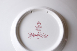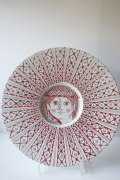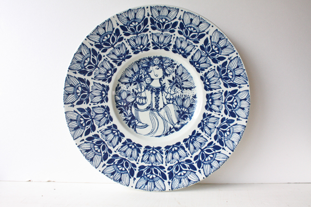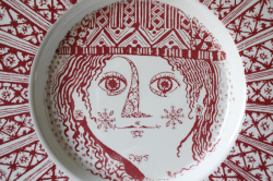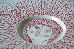 デンマークの人気デザイナーBjorn Wiinblad(ヴョルン・ウィンブラッド)の美しい絵皿です。帽子をかぶったお目めぱっちりの少女がモチーフとなっています。周りが放射線状になっていて、中央の少女を引き立たせています。赤色の単色ながら、ヴィンブラッドならではの華やかさがあります。壁に飾れるようにヒモを通す穴が開いています。当店初入荷のデザインです。