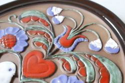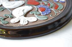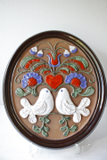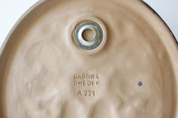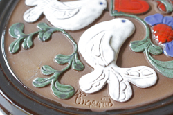 スウェーデンのガブリエル社製の陶器の壁掛けです。こちらは丸いタイプの陶板で真ん中にはぷっくりとした可愛らしい鳩が、ハートを持ち上げているようなデザインになっています。周りのフラワーモチーフといい、ハートに白鳩と最強に可愛らしいモチーフが詰まった素敵な陶板です。裏面には、壁に掛ける穴が開いています。