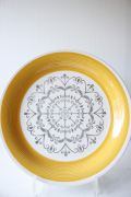 スウェーデン、Gefle社(ゲフレ)のmariaシリーズのディナープレートです。こちらは丸いフォルムにビタミンカラーの黄色で描かれた太いハンドペイントの縁取り、真ん中のモチーフも丸いフラワーモチーフで、濃淡のあるスタンプがレース編みを敷いたようなロマンティックな印象です。お料理を乗せても淵が黄色で鮮やかで映え、使わないときは内側のモチーフが可愛いので、お皿立てなどに飾っても楽しめそうです。