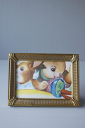 デンマークのアンティークショップで見つけたフォトフレームです。中にはアンティークの刺繍やレース、また写真や古い絵本の切抜きを入れても素敵なインテリアとしてお使いいただけるでしょう。掲載写真には古い絵本の切り抜きが入っています。