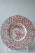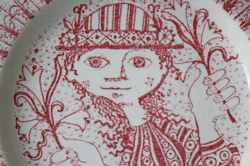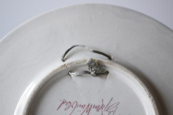デンマークの人気デザイナーBjorn Wiinblad(ヴョルン・ウィンブラッド)の美しい絵皿です。中央に両手にユリのようなお花を持った女の子が微笑んでいます。女の子を囲むようにして、ユリのお花が緻密に描かれています。単色ながら、ヴィンブラッドならではの華やかさがあります。壁に飾れるようにヒモを通す穴が開いています。