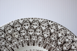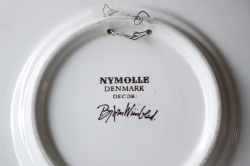 デンマークの人気デザイナーBjorn Wiinblad(ヴョルン・ウィンブラッド)の美しい絵皿です。中央に両手にユリのようなお花を持った女の子が微笑んでいます。女の子を囲むようにして、ユリのお花が緻密に描かれています。単色ながら、ヴィンブラッドならではの華やかさがあります。壁に飾れるようにヒモを通す穴が開いています。
