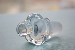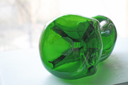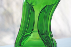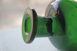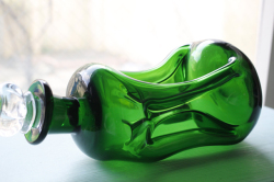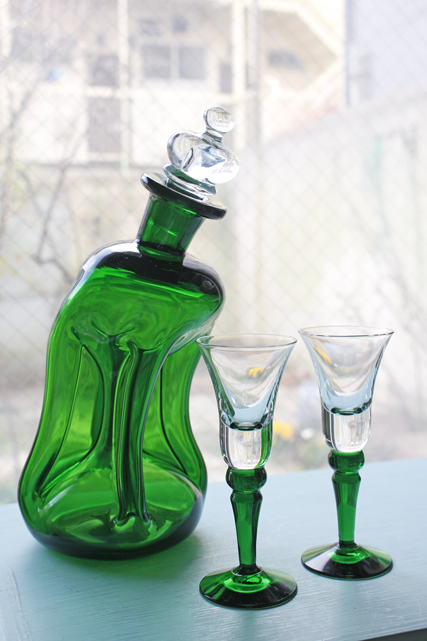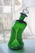 デンマークで見つけたHolmegaardのヴィンテージガラスのガラスボトルです。中央部分を細くして滑らかな曲線を表現し、可愛らしいお花型の蓋を配置してオブジェとして飾っておきたい技術性の高いアイテムです。美しいグリーンとキラキラと輝くクリアカラーが魅力です。