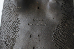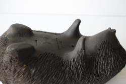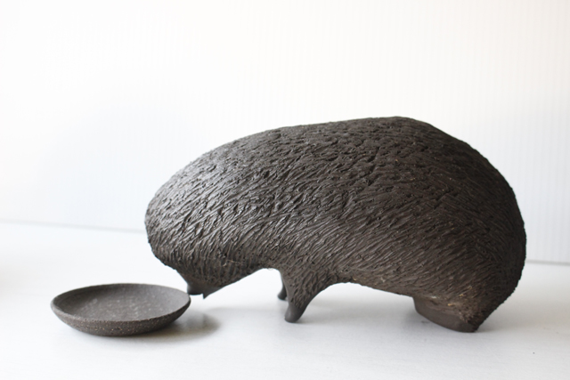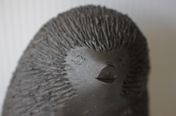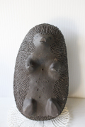 デンマーク、エレン・カールセンデザインのハリネズミのお母さんです。とても美人で優しい目のお母さんです。こちらは水を飲んでいる様子をデザインしているので、入れ物に口を付けるようなフォルムとなっています。画像は、表情などが分かりやすいので、もたれ掛けさせて立たせています。釉薬のかけられていない、素朴な土の質感が感じられ、丁寧に針の様子が表現されています。ハンドメイドならではの、1点1点表情や背中の針の感じも違っていているところが魅力です。