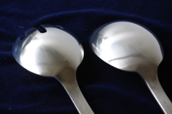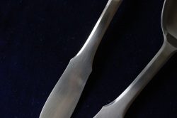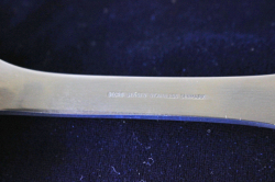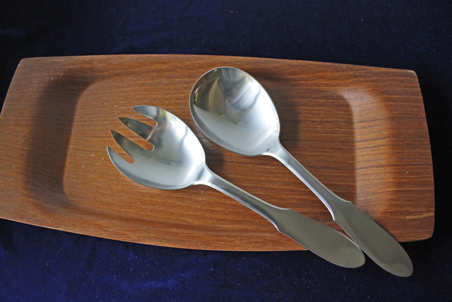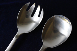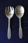 デンマーク、Georg Jensenのサービングセットです。素材はステンレスでマット仕上げとなっており上品な輝きです。真ん丸の大きめサイズのスプーンですので、お料理やデザートなど取り分け料理に添えて重宝しそうです。ステンレス素材なので、日常でも気軽にお使いいただけるでしょう。現行品のGeorg Jensenのカトラリーは海外製造ですが、こちらのヴィンテージ品はデンマーク製です。