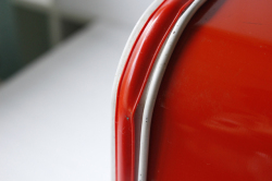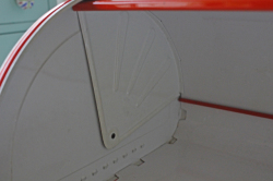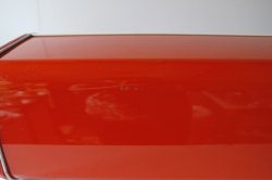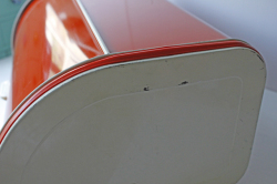 ■コンディション:ふたカバーの右奥部分に一部外れているところがあります。その部分のため、開閉した時にその部分にあたり擦れて引っ掛かります。器用な方でしたらお直しも可能です。全体的に薄らとした変色、サビ、小キズ、擦れなどがあります。サイドの赤いラインはビニール素材でデコレーション用につけられています。その他経年使用による劣化などもあります。ヴィンテージ雑貨にご理解の上、ご注文下さいませ。コンデションを考慮した価格となっております。