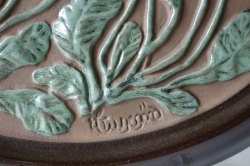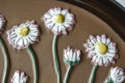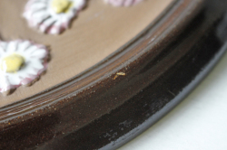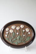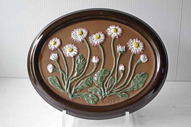 スウェーデンのガブリエル社製の陶器の壁掛けです。こちらは楕円タイプの陶板で真ん中にはぷっくりとした可愛らしいデイジーのフラワーモチーフがデザインされています。レトロ可愛いほっこりとしたデザインでおススメです。裏面には、壁に掛ける穴が開いています。