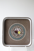 スウェーデン、Upsala Ekeby(ウプサラエクビー)の角皿です。デザインはマリ・シムルソンで1940年代~1960年代からグスタフスベリとウプサラエクビーのトップデザイナーとして働いていました。こちらは厚みのあるしっかりとした角皿で、中心部から順にフラワーモチーフ、幾何学模様、水玉、波模様ととてもユニークなデザインになっています。素焼き部分のコンビネーションが素朴でほっこりとした角皿です。