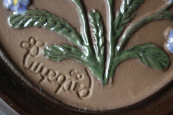 スウェーデンのガブリエル社製の陶器の壁掛けです。こちらは楕円タイプの陶板で真ん中にはぷっくりとした可愛らしい忘れな草がデザインされています。レトロ可愛いほっこりとしたデザインでおススメです。裏面には、壁に掛ける穴が開いています。