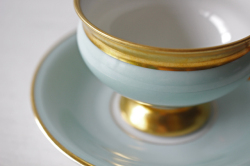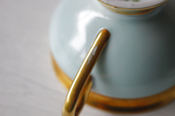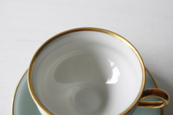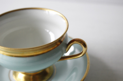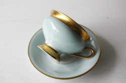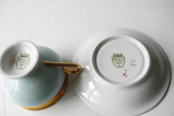 デンマーク、Koebenhavns Porcelaensmaleri社のデミカップ&ソーサーです。こちらはパステルミントカラー×縁取りのゴールドのコンビネーションと、コロンとしたフォルムがとても可愛らしいデミカップで、ヴィンテージらしいデザインがとても素敵です。