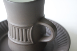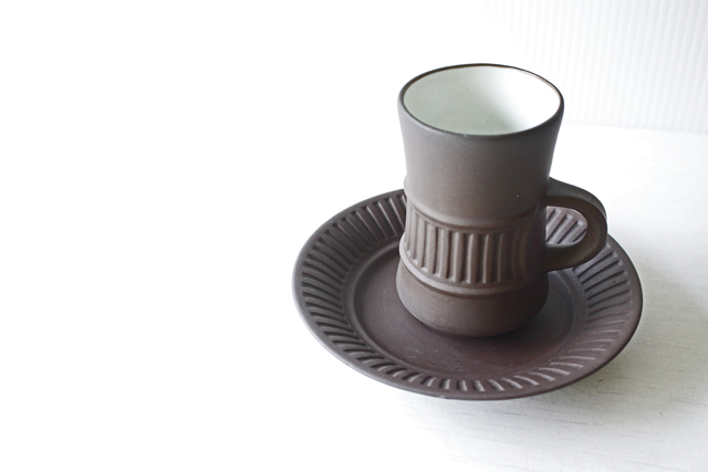 デンマーク、Jens.H.Quistgaard(イェンス・クイストゴー)デザインFlame Stone(フレームストーン)シリーズのカップ&ソーサーです。フレームストーンは、1957年にDANSKより発表されました。独創的なフォルム、味わい深いマットな質感と内側の白いコントラストが素敵です。クイストゴー本人もアトリエ兼自宅で愛用していたことでも有名です。こちらのシリーズは市場でも流通量が少なく、また繊細な陶器のためコンディションのよいものが入荷するのは稀なのでお探しの方はお見逃しなく!