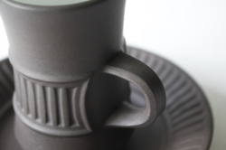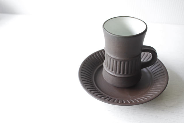 デンマーク、Jens.H.Quistgaard(イェンス・クイストゴー)デザインFlame Stone(フレームストーン)シリーズのカップ&ソーサーです。フレームストーンは、1957年にDANSKより発表されました。独創的なフォルム、味わい深いマットな質感と内側の白いコントラストが素敵です。クイストゴー本人もアトリエ兼自宅で愛用していたことでも有名です。こちらのシリーズは市場でも流通量が少なく、また繊細な陶器のためコンディションのよいものが入荷するのは稀なのでお探しの方はお見逃しなく!