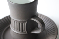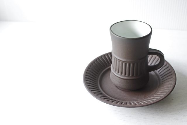 デンマーク、Jens.H.Quistgaard(イェンス・クイストゴー)デザインFlame Stone(フレームストーン)シリーズのカップ&ソーサーです。フレームストーンは、1957年にDANSKより発表されました。独創的なフォルム、味わい深いマットな質感と内側の白いコントラストが素敵です。クイストゴー本人もアトリエ兼自宅で愛用していたことでも有名です。こちらのシリーズは市場でも流通量が少なく、また繊細な陶器のためコンディションのよいものが入荷するのは稀なのでお探しの方はお見逃しなく!