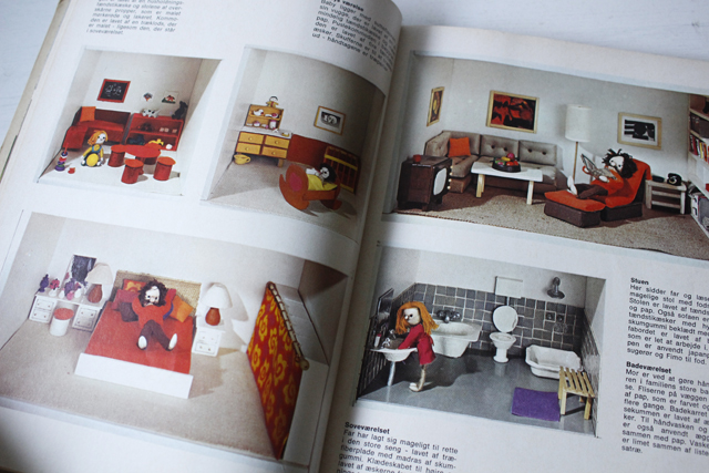 デンマークで見つけた手芸本です。デンマーク語で“Dukkehus Bog”と言うタイトルの通り、人形の家の本と言うことで、お人形、ドールハウスの作り方が載っています。レトロ感溢れる可愛らしい作品で、北欧らしいほっこりとした印象です。