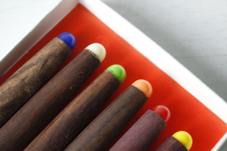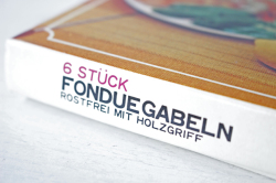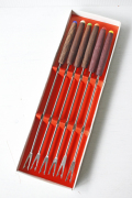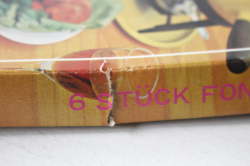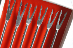 デンマーク製、ヴィンテージフォンデュ用カトラリーです。こちらは木製のハンドルに先っぽが一本一本違うカラーになった6本セットで、フォンデュ用に作られたものです。テーブルを囲んでワイワイとチーズやオイルフォンデュを楽しむのにぴったりのカトラリーです。日本で製造されて、ヨーロッパに輸出されたもののようで、パッケージはドイツ語で書かれています。