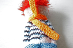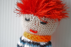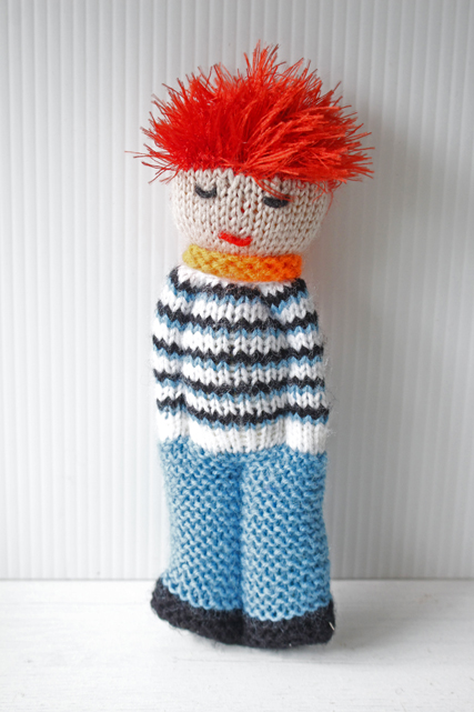 ハンドメイドのニット製のお人形です。こちらは赤毛の男の子でストライプのセーターにマフラーがおしゃれです。ちょっと悪ガキっぽい表情が二ユニークですね。 ■サイズ :横幅7cm、高さ20cm ■コンディション:目立つダメージなく、よいヴィンテージコンディションです。