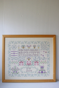 ヴィンテージ刺繍のフレーム入り壁掛けです。サンプラー(昔の刺繍見本の図案集)をモチーフにしたデザインです。数字やアルファベット、お花などいろいろな柄を取り混ぜて刺繍されています。パステルカラーの配色で優しい印象です。海外の刺繍や織物をフレーム仕立てにする場合、よくある仕立て方としてガラスなしのフレームに入れる方法です。こちらもガラスなしです。