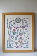 ヴィンテージ刺繍のフレーム入り壁掛けです。サンプラー(昔の刺繍見本の図案集)をモチーフにしたデザインです。数字やアルファベット、お花などいろいろな柄を取り混ぜて刺繍されています。パステルカラーの配色で優しい印象です。海外の刺繍や織物をフレーム仕立てにする場合、よくある仕立て方としてガラスなしのフレームに入れる方法です。こちらもガラスなしです。