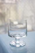 デンマーク、Holmegaard(ホルムガード)のガラスのグラスです。こちらはStubというシリーズで1950年代後半から1990年までの長きに渡り作られていたベストセラーです。美しいフォルムにスタッキングできるところから、収納もバランスよく出来るため、とても実用的です。こちらは小さなスナップス用のグラスになりますが、四角の脚付きフォルムですので、日本酒や、豆皿のように梅干しなどを一つ入れて食卓に出してもステキです。時を経て2019年には一部のサイズが復刻されていますが、こちらの小さいサイズはヴィンテージのみになります。当時の作品は一つ一つのガラスの厚みなども違い、味わい深いのもおススメです。