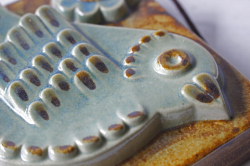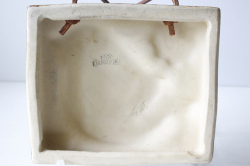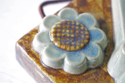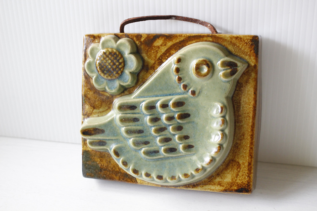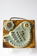スウェーデン、EGO社の陶板の壁掛けです。小鳥とお花がデザインされた本当に愛らしい作品で、ブラウンとブルーの組み合わせが落ち着いた雰囲気も醸しています。画面から飛び出したように立体的に作られています。EGO社の作品は市場でも少なく希少になっております。お探しの方はお見逃しなく。上部に壁掛け用の穴が開いているので、革ひもなどを付けていただければ吊り下げて飾ることができます。