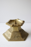 デンマークで見つけた真鍮のキャンドルホルダーです。こちらはどっしりとした安定感のあるデザインで、アンティークらしい雰囲気があります。レースなどと一緒に飾っていただくと一層素敵です。オブジェとして飾って頂くと、落ち着いたアンティークのインテリアを演出できそうです。ろうそくを刺す針も太めなので太い大きなろうそくに向いています。
