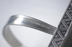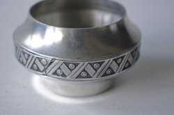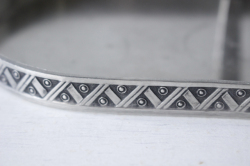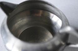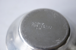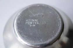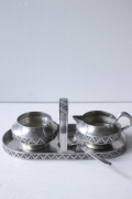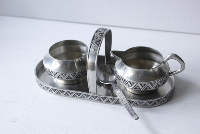 ノルウェー製のピューターのシュガー、クリーマーセットです。こちらは丁寧な作りの味わいのあるデザインで、燻した様な銀色が美しい作品です。今回はトレイとスプーンもお揃いで付いており、トレイには持ち手がありますので、持ち上げたり動かすのも簡単で機能的です。コンディションもよく、ピューターがお好きな方におすすめしたい作品です。