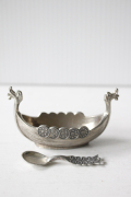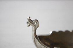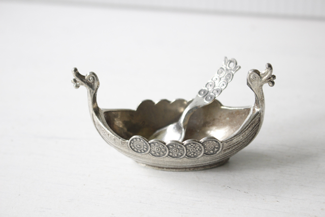 北欧ヴィンテージのバイキング船のオブジェです。ピューター(錫)製のしっかりとした作りで、手作り感あふれる雰囲気がよいですね。勇ましいフォルムのバイキング船で、シルバーカラー一色のモノトーンの作りなので、スタイリッシュに飾って頂けそうです。スプーンがついているのでテーブルソルトやハーブ入れにいかがでしょうか。お揃いでバイキングのオブジェと一緒に飾っても素敵ですね。