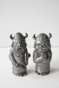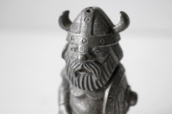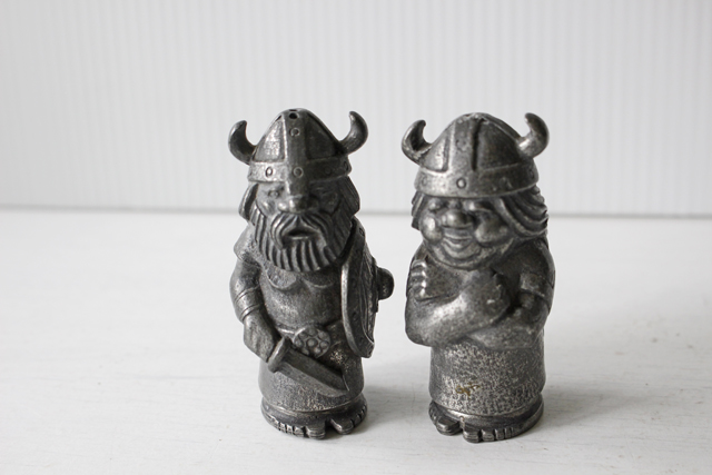 北欧ヴィンテージのバイキングの夫婦のオブジェ(ソルト&ペッパー)です。ピューター(錫)製のしっかりとした作りで、手作り感あふれる雰囲気がよいですね。勇ましい風貌のお父さんと優しい微笑みのお母さんで、シルバーカラー一色のモノトーンの作りなので、スタイリッシュに飾って頂けそうです。