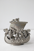 北欧ヴィンテージのバイキングのオブジェです。ピューター(錫)製のしっかりとした作りで、手作り感あふれる雰囲気がよいですね。船に乗ったバイキングが勇ましく、シルバーカラー一色のモノトーンの作りなのでスタイリッシュに飾って頂けそうです。