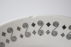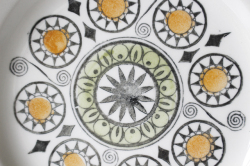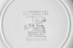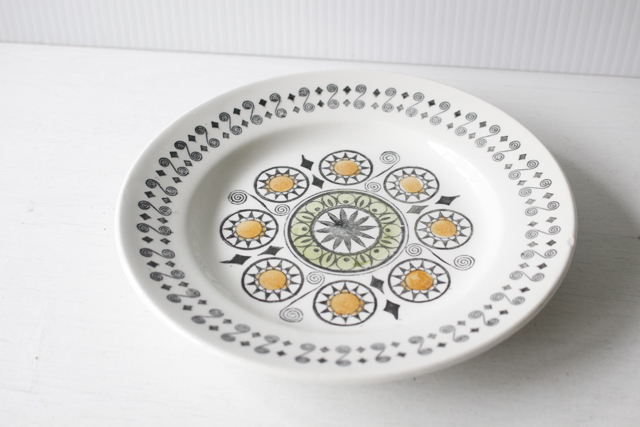 デンマークで見つけたイギリス、Broadhurst社製のケーキプレートです。こちらはサークル模様で黄色やオレンジなどのカラーが色付けされており、とてもレトロ感のあるデザインです。リムの部分にまでびっしりとデザインされていますので、お料理を乗せても華やかな印象で、厚みがあり強い造りですので、デイリー使いにもピッタリです。