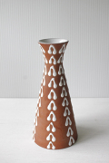 デンマーク Joska窯と同時期に運営されていたZeuthen(ツォィテン)窯の花瓶です。1940年代後半に存在し、シャモット(レンガなどに使う土)の赤地を使った作品が特徴的です。シャープなフォルムで、一輪挿しとしても存在感があります。ハンドペイントで描かれた白いモチーフはぷくぷくと立体的で大変可愛らしい印象です。