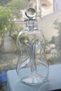 デンマークで見つけたホルムガードのヴィンテージガラスのガラスボトルです。中央部分を細くして滑らかな曲線を表現し、真ん丸の蓋を配置してオブジェとして飾っておきたい技術性の高いアイテムです。美しいグリーンとキラキラと輝くクリアカラーが魅力です。