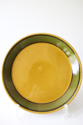 1960年代にFiggioと合併したノルウェーのStavangerflint(スタヴァンゲルフフリント)社のプレートです。デザインは、当時大変人気のあったデザイナー、Inger Waageによるものです。Waageは、華麗なハンドペイントの作品群でも知られ、その作品は今もコレクターの対象となっています。こちらはマスタードカラーの地にモスグリーンとブラウンの太めのストライプが描かれている絵付け師さんの筆跡が感じられる温かみのあるデザインです。すっきりとしたモダンなフォルムは男性がお使いになっても素敵な雰囲気です。市場でもなかなか見かけないデザインでお勧めです。