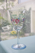 スウェーデンの老舗クリスタルメーカー、Orrefors社のヴィンテージのワイングラスです。Arne Lindblomによる優しい花柄のハンドペイントと、Eva Englundのフォルムデザインがマッチした作品です。下部は6角形で口は少し広がったような円になったエレガントなフォルムにお花がデザインされた可愛らしいお品です。