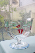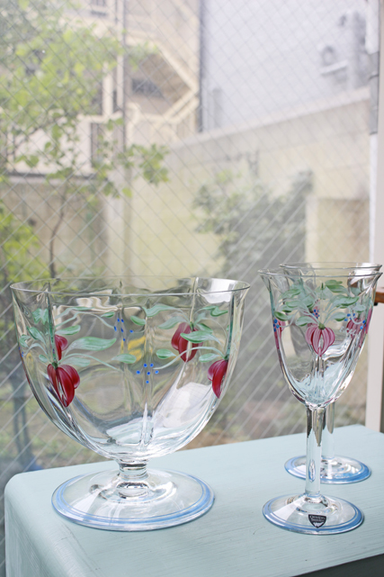 スウェーデンの老舗クリスタルメーカー、Orrefors社のヴィンテージの脚付きボウルです。Arne Lindblomによる優しい花柄のハンドペイントと、Eva Englundのフォルムデザインがマッチした作品です。下部は6角形で口は少し広がったような円になったエレガントなフォルムにお花がデザインされた可愛らしいお品です。フルーツパンチやシャングリアなどを入れてサーブするのにお使いいただいてもよいです。