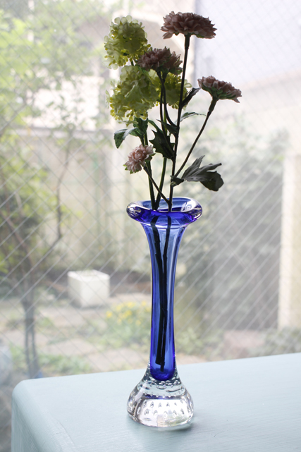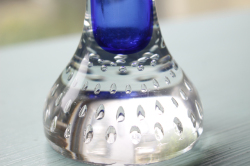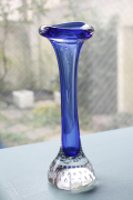 ヴィンテージのスウェーデン製のベースです。こちらはホルムガードの看板デザイナーPer Lutkenの作品でBONEというタイトルが付いています。ほっそりとしたボディに上下は丸みを帯びた個性的なデザインです。足元にはクリアガラスの中に規則的に気泡が入れてあり光にあたってキラキラと輝きます。カラーがいろいろありますので、お部屋のお好みに合わせて飾って頂けます。