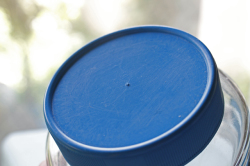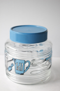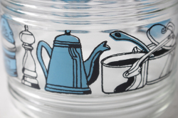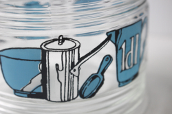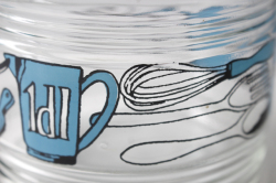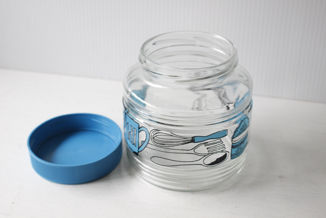 デンマークで見つけたガラス製のキャニスターです。こちらはどっしりとしっかりしたガラスの容器でレトロ感溢れるキッチングッズがぐるりと描かれています。蓋のブルーカラーが爽やかでノスタルジックな印象です。ガラスの容器で口も大きいですので、お手入れしやすく、塩、砂糖、コーヒーなどに、お使い頂け、北欧らしくキッチンを明るく彩ってくれ、お勧めです。