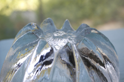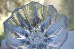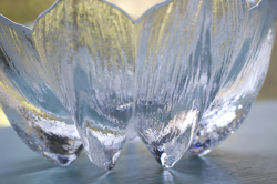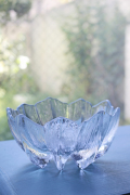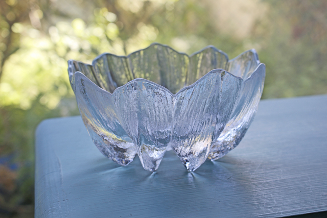 デンマーク、ホルムガード社のヴィンテージのガラスの器です。こちらはパッと花が咲いたような華やかなフラワーモチーフで大変美しい器です。お料理を盛り付けたり、オブジェとして飾るのも素敵です。