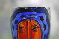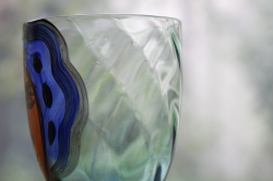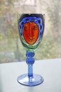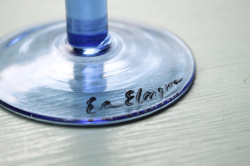ヴィンテージのアートグラスです。ハンドペイントで大胆に女性の顔が描かれたユニークな作品で、実用的だけでなく、飾っても楽しめそうですね。こちらはスウェーデンのデザイナー、Ea Elmgrenと作家さんの直筆のサインもグラスに書かれています。絵が個性的でユニークなだけでなく、グラス自体も持ち手部分の丸みのあるフォルムに側面は波打っており、コバルトブルーの色が美しく、グラスの底の部分も透明感のあるエメラルドグリーンでとても素敵なデザインです。