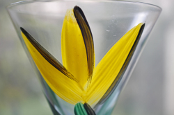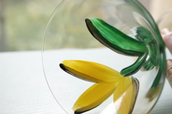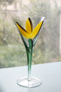 ヴィンテージのアートグラスです。ハンドペイントで大胆に黄色いチューリップが描かれたユニークな作品で、実用的だけでなく、飾っても楽しめそうですね。こちらはフォルムもスマートで美しいカクテルグラスで、個性的なグラスをお探しの方にお勧めです。