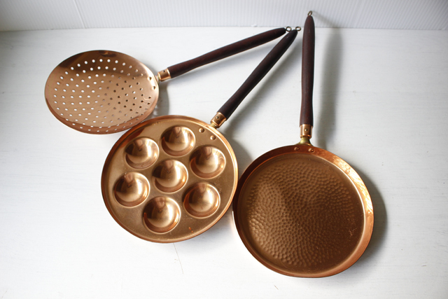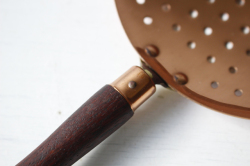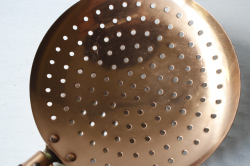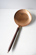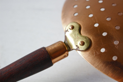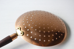 デンマークで見つけたチーク×銅製の水切りです。飴色の美しい水切りで、大変おしゃれでです。持ち手がチークで高級感もあり、取っ手に穴が開いているので、フックに引っ掛けてキッチンのデコレーションとしても使えそうですね。